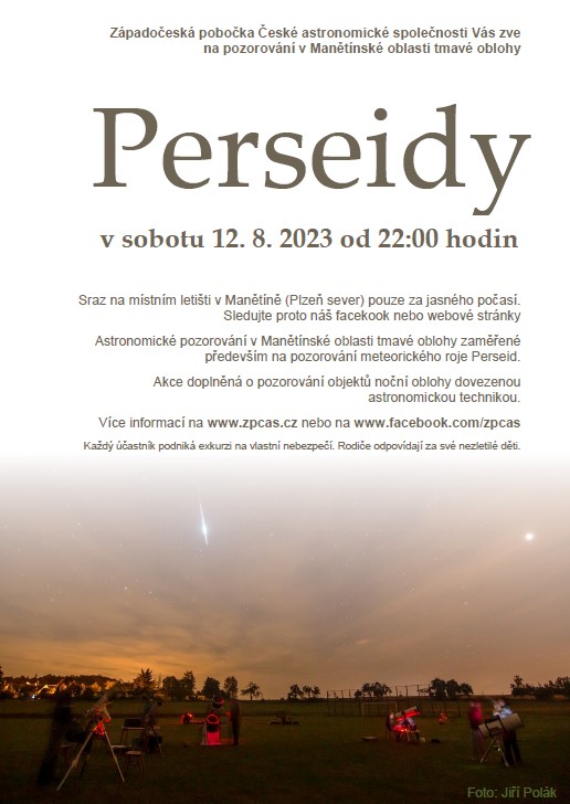 Zajímáte se o astronomii? Tak si přijďte prohlédnout objekty vzdáleného vesmíru, jako jsou hvězdokupy, mlhoviny a galaxie nebo některé planety sluneční soustavy. Západočeská pobočka České astronomické společnosti vás zvou na veřejné pozorování v Manětínské oblasti tmavé oblohy v sobotu 12. 8. 2023 od 22:00 na manětínském letišti. Čeká vás večer plný vzdálených galaxií, hvězdokup a mlhovin pod jedinečnou tmavou oblohou. Aktuální organizační informace najdete na facebookových stránkách ZPČAS.