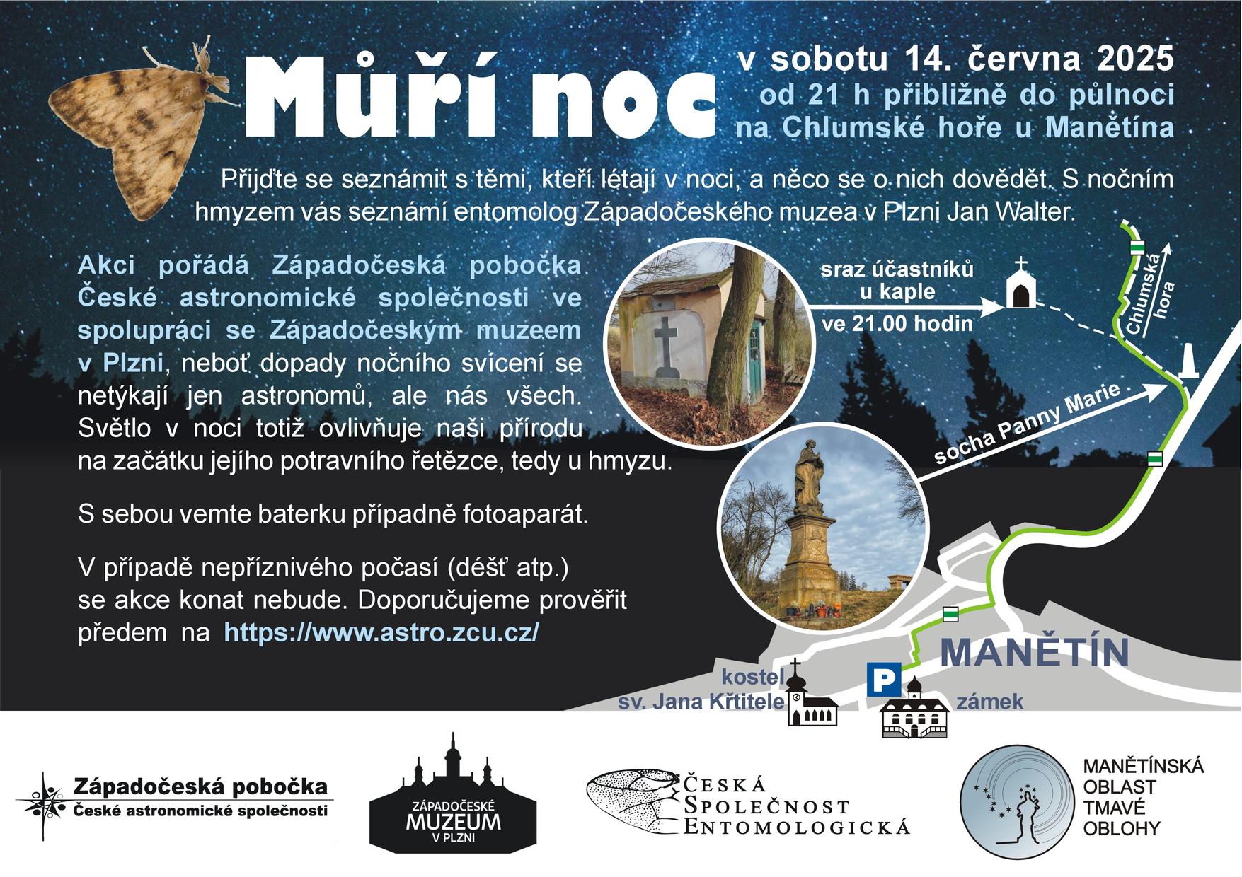 Červnové noci jsou ideální čas pro setkání s fascinujícími nočními tvory. Západočeská pobočka České astronomické společnosti ve spolupráci se Společností pro ochranu motýlů (SOM) a Západočeským muzeem v Plzni vás zve na netradiční akci Můří noc, která se uskuteční v sobotu 14. června od 21:00 do půlnoci na Chlumské hoře u Manětína, v srdci Manětínské oblasti tmavé oblohy.