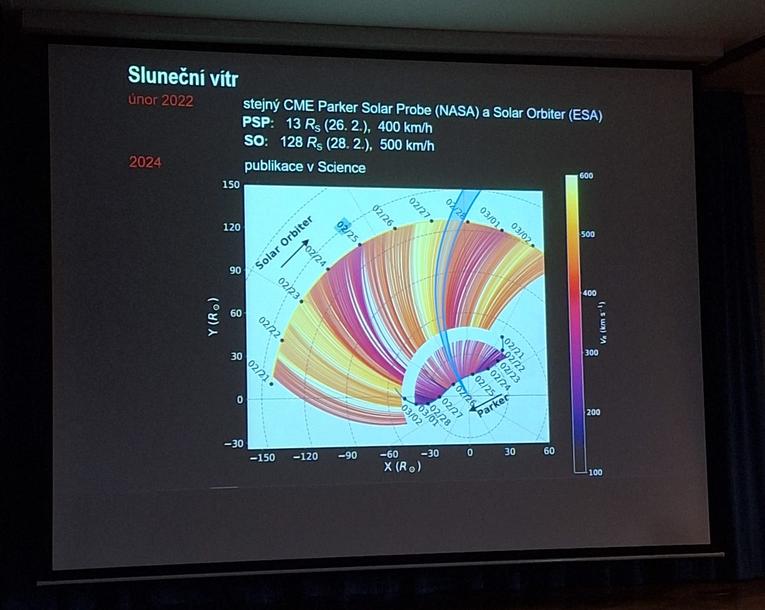 - Alfvénovy vlny a sluneční vítr: Alfvénovy vlny představují příčné rozvlnění magnetických siločar a hrají klíčovou roli v urychlování slunečního větru a zahřívání korony. Důkaz přinesla koordinovaná pozorování sond Parker Solar Probe (PSP, NASA) a Solar Orbiter (SO, ESA). Když PSP 26. 2. 2022 ve vzdálenosti 13 poloměrů Slunce zaznamenala CME (koronální výron hmoty) rychlostí 400 km/s, sonda SO o dva dny později (28. 2.) detekovala tentýž CME ve vzdálenosti 128 poloměrů Slunce s rychlostí 500 km/s.