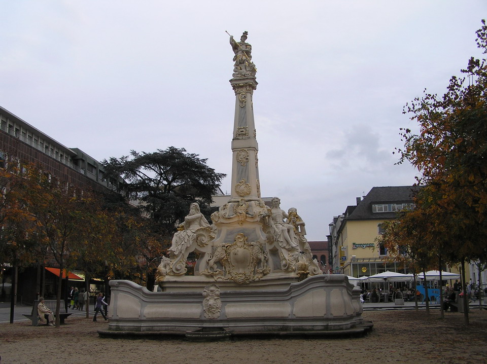 Bohatě zdobená kašna na náměstí v Trieru. |