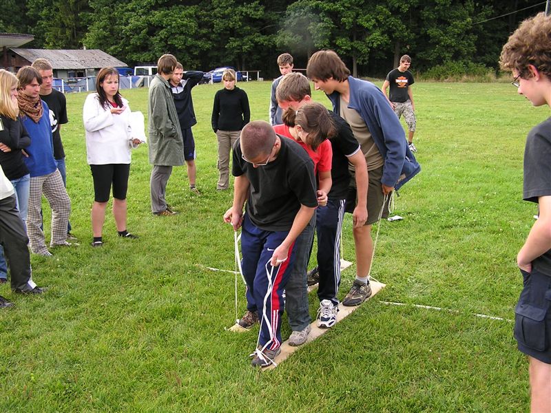 Poslední aktivitou, která se ještě dala stihnut před závěrečným hodnocením, bylo za úkol pomocí dvou prken a provázků překonat vzdálenost 20 m v co nejkratším trase. Každá skupina přišla s nějakým způsobem, ale nejrychlejší byla nakonec přece jen jedna a s časem 20 sekund zvítězila.