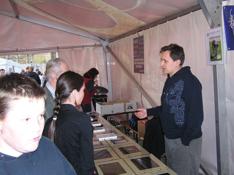 V pátek 26. září se tak pobočka zúčastnila této akce na dvou místech, v Plzni, pod záštitou Techmania science center v areálu Škodovky u 5. brány a na Hvězdárně v Rokycanech (informace o noci vědců v Rokycanech naleznete na stránkách hvězdárny). V Plzni se kromě Západočeské pobočky ČAS objevila také H+P Plzeň a Katedra obecné fyziky fakulty pedagogické ZČU v Plzni. U stánku pobočky byla k vidění fotografická výstava „Vesmír jak ho známe i neznáme“. Návštěvníci si mohli prohlédnout například fotografie ze zatmění Slunce, Měsíce, komety, mlhoviny a galaxie. Na zvídavé otázky ze strany návštěvníků ohledně fotografií odpovídala dvojice v podání Josefa Jíry a mé maličkosti. Návštěvníkům jsme nezůstali nic dlužní, zvláště mladším. Po odpovědi na otázku dostali svítítko s motivem Noci vědců nebo vystřihovánku. Otázky byly jednoduché a přiměřené věku tázaného, např.: Na jaké fotografii je Slunce?