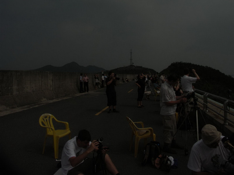 Hlasime se, stale trochu smutni. Ale delali jsme co jsme mohli, zivot jde dal. Ze chmur nas dostavaji vsedni starosti. Jedeme do Pekingu. Uz samotny nastup do vlaku byl zajimavy, nez jsme stihli zaplatit taxi, meli jsme kufry na voziku a dva domorodci nas nutili ke spechu, ukazovali na cas odjezdu a na hodinky. Mysleli jsme ze je to treba sluzba nadrazi, ale nemeli uniformu. Nakonec se z nich vyklubali akorat vykukove, kteri chteli 250 juanu za to, ze nam pomuzou s kuframa. Meli budku v prostoru parkoviste, voziky, nejake sefy, organizovane to meli. Rekli jsme ze neberem, hned slevili na 150, proste lecka na neznale turisty. Vzali jsme si kufry, nechali si ukazat kudy a nechali jsme je tam, at zkusi oskubat jine. Casu bylo dost. Zavazadla musite nechat projet rentgenem, ale to uz jsme znali ze vcerejska, trva to jen chvilku. Kazdy vlak ma urcenou cekarnu, ze ktere se vas pred odjezdem vlaku pres kontrolu jizdenek pusti na nastupiste. Ve vlaku jsme potkali slovenskou skupinu 13ti banskobystrickych spriznenych dusi s vedoucim Stano Kanianskym, vedoucim planetaria v Ziaru nad Hronom. Srdecni lide, hned jsem musel ochutnat jejich pramenity 50% zivotabudic. Zatmeni jich videla cast, ktera stihala dobrou oblohu letadlem do Wuzhou a mistni dopravou co nejdal do vnitrozemi. Meli trochu oblacnost, ale videli a nafotili, ukazovali nam sve fotky korony. Krasa. Cast, ktera zustala v Shanghaji byla alespon centrem pozornosti mistnich medii. Skupinka z naseho hostelu v Sanghaji, ktera si pronajala mikrobus na pobrezi v centralni linii (polaci, americani a jeden korejec) videla castecnou fazi, pak jim prisly mraky a pri uplne fazi zmokli. Proste smula. Z televizniho zpravodajstvi mam foto reporterky pod destnikem primo v setmele Shanghaji. Jeste k vcerejsi ceste vlakem, primo na nadrazi pred odjezdem se nas ptal clovicek se stativem, podle vzhledu evropan, kde jsme sehnali listky na vlak. My jsme je meli z naseho hostelu, kde nam je pripravili v recepci, protoze jsme vedeli ze primo na nadrazi je sezenete jen stezi, takze jsme mu nepomohli. Asi je prodavaji, i kdyz zadnou pokladnu jsme nevideli a listek chteji hned pri vstupu dovnitr, ale vetsinou jsou uz v dobe odjezdu vlaku vsechny listky prodane. Vime o dvou pricinach, jedna je, ze cinanu je zkratka hodne. Druha, ze listky kupuji prekupnici a primo pred nadrazim je pak prodavaji za nasobne vyssi ceny. To rano ale zadny prekupnik venku nestal. Zato pri navratu jsme jich minuli desitky. Ohledne vlaku si neni na co stezovat, jezdi pres 200 km/h, vsude cisto, prostredi posudte dle fotek. Meli jsme nejhorsi tridu co tu jezdi (hard seat) a kez by takove jezdili u nas, opravdu neni socialisticky moloch jako socialisticky moloch, s tim nasim se to srovnavat opravdu neda. Zdravi obe skupiny, jedna z cech a druha ze slovenska.