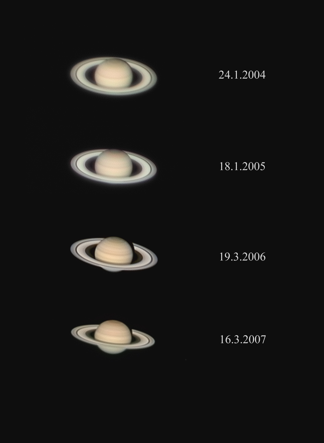 Planeta Saturn je jeden z nejvděčnějších objektů pro pozorování dalekohledem. Během jeho oběhu kolem Slunce se mění sklon prstenců vůči Zemi. V současné době se prstence uzavírají, nejvíce otevřené byly roku 2004 a zcela se uzavřou v roce 2009. Tuto změnu sklonu prstenců dokumentují 4 snímky, pořízené přibližně s ročním odstupem. Každý snímek vznikl složením z mnoha (cca 100) jednotlivých snímků. Tímto skládáním poklesne šum a je možné zvýraznit detaily.