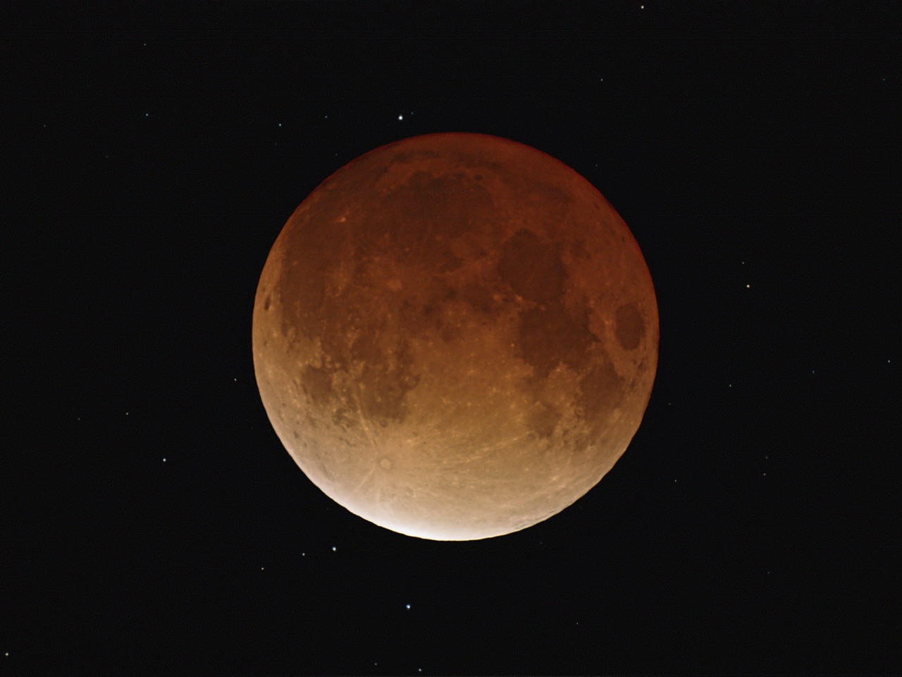 Během úplného zatmění je možné pozorovat Měsíc i s hvězdami v okolí, které by jinak přezářil. Fotografická emulse se však nedokáže vyrovnat s tak velkým kontrastem jako oko, proto jsem tuto fotografii složil ze dvou, aby co nejlépe odpovídala pohledu do dalekohledu. Hvězdy na pozadí jsou exponovány 8s a Měsíc jen 1s.