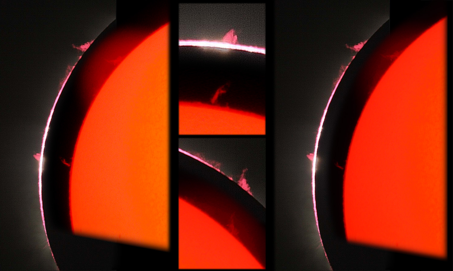 Obrázek je kombinací snímku protuberancí v čase T2 a fotografie z protuberančního dalekohledu pořízené zhruba 2 hodiny před samotným zatměním. Je dobře vidět časový vývoj protuberancí. Pro lepší názornost bylo zpracování pro oba výřezy mírně odlišné, neboť pro každou se hodilo trochu jiné potlačení pozadí. Po stranách jsou celkové pohledy pro oba způsoby zpracování. Je možno porovnávat vzhled protuberancí v chromosférickém filtru a bez jakéhokoli filtru při úplném zatmění Slunce (tedy při jediné možnosti kdy je možno protuberance bez pomoci filtru na krátký okamžik pozorovat). S podobným snímkem protuberancí pořízeným až 2 hodiny po zatmění mne se zpracováním (ale opět ne s nápadem) předběhl Jirka Polák na stránce Úplné zatmění Slunce 2006 Porovnání protuberancí při zatmění a přes chromosférický dalekohled.