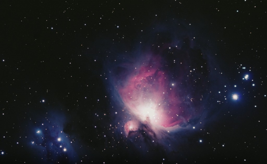 V jednom z nejhezčích souhvězdí, Orionu, najdeme nejjasnější mlhovinu hvězdné oblohy M42. Zářící plyn v ní obklopuje horké mladé hvězdy vzdálené jen 1500 světelných let. Za dobrých podmínek je viditelná pouhým okem jako rozmazaná hvězdička, větší dalekohled spolu s výbornými pozorovacími podmínkami rozliší její bohatou strukturu s temnou mlhovinou uprostřed. Nádherné barevné odstíny nám ukáže ale až fotografie. Uprostřed mlhoviny se nachází čtveřice hvězd (otevřená hvězdokupa) zvaná Trapéz. Jasnost mlhoviny je 4.0 magnitudy, rozměr 1 x 1.5°. Těsně vedle M42 se nachází další emisní mlhovina M43 (jasnost 9.0 mag., velikost 20'). V levé části velkého snímku (severně) se nachází otevřená hvězdokupa NGC 1977 obklopená reflexní mlhovinou (jasnost 7.0 mag., velikost 20'x10'), vpravo (jižně) otevřená hvězdokupa NGC 1980 (jasnost 2.5 mag., velikost 15').