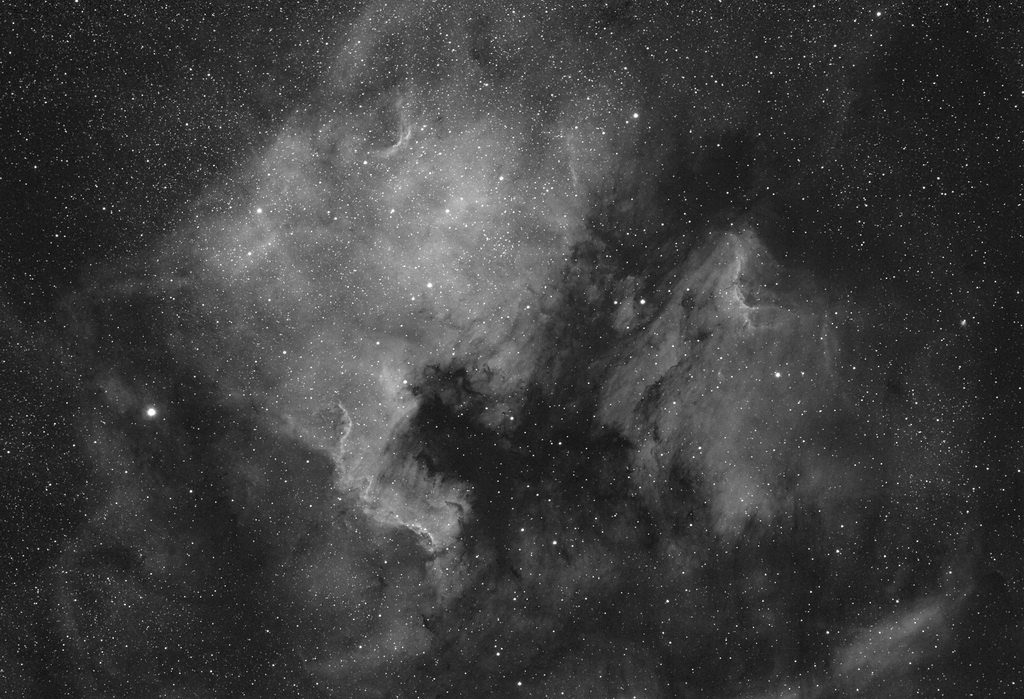 Fotografie známého komplexu mlhovin v souhvězdí Labutě pořízený přes Ha filtr. Velká jasná emisní mlhovina Severní Amerika - NGC 7000 o úhlovém průměru 2,5°. V pravé části na ni navazuje menší a slabší mlhovina Pelikán - IC 5067 o úhlovém průměru 1,5°. Obě mlhoviny od sebe odděluje záliv temné hmoty v popředí, který zakrývá střed velké emisní mlhoviny v pozadí a připomíná Mexický záliv na mapě Ameriky. Mlhoviny se nachází v souhvězdí Labuti východně od nejjasnější hvězdy Deneb.