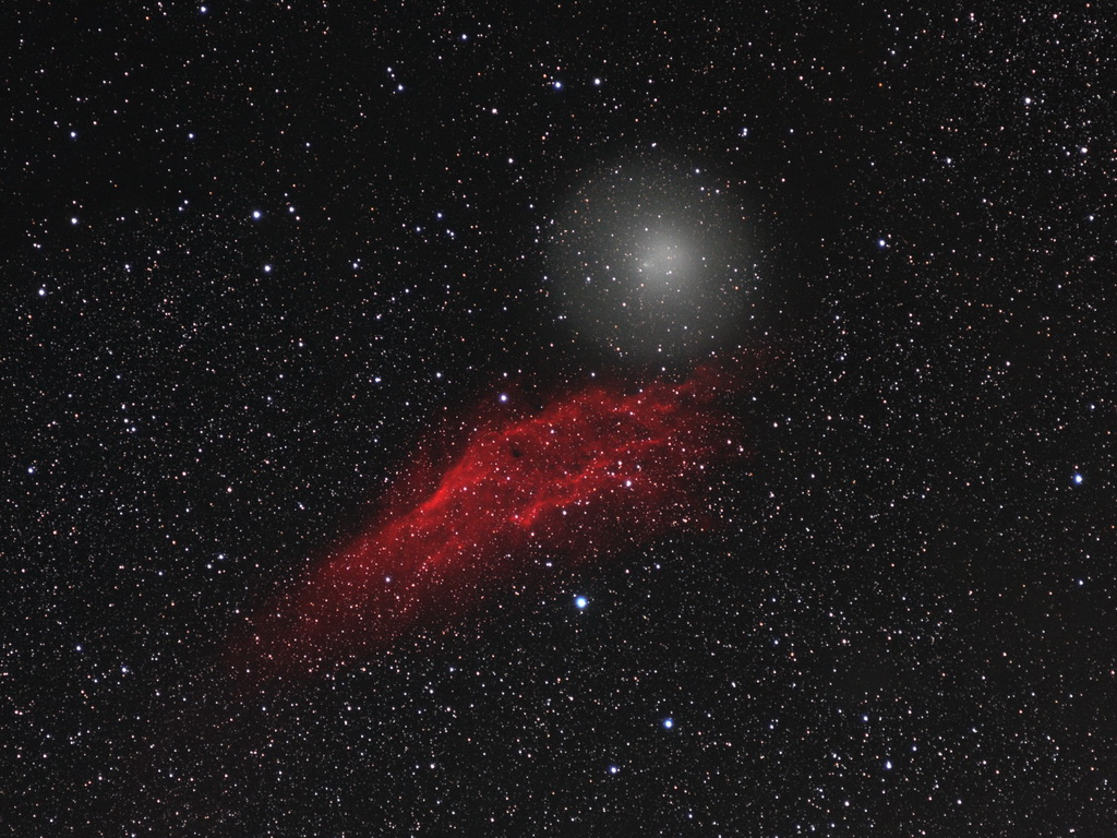 Ač to na první pohled není zřejmé, na noční obloze můžeme každou noc pozorovat desítky komet. Většina z nich jsou však natolik slabé objekty, že je možné je detekovat jen prostřednictvím velkých dalekohledů opatřených citlivými CCD kamerami. Jednou takovou kometou byla i kometa 17P/Holmes. Tedy až do okamžiku, kdy 24. 10. 2007 během necelých 24 hodin zjasněla natolik, že se najednou stala nejjasnější kometou na obloze a byla viditelná několik měsíců i pouhým okem. V tomto okamžiku se z nezajímavé komety, o které vědělo na světě jen hrstka zasvěcených astronomů, stala nejzajímavější kometa a objekt vůbec. Zajímavé je, že u této komety se nejedná o první zjasnění v celé její historii. Minulé takové nastalo roku 1892 a zapříčinilo právě její objevení. Proč k takovýmto zjasněním dochází, ještě nevíme, ač hypotéz je hned několik. Na tomto krásném snímku můžeme kometu zastihnout v blízkosti známé mlhoviny s názvem Kalifornie v souhvězdí Persea.
