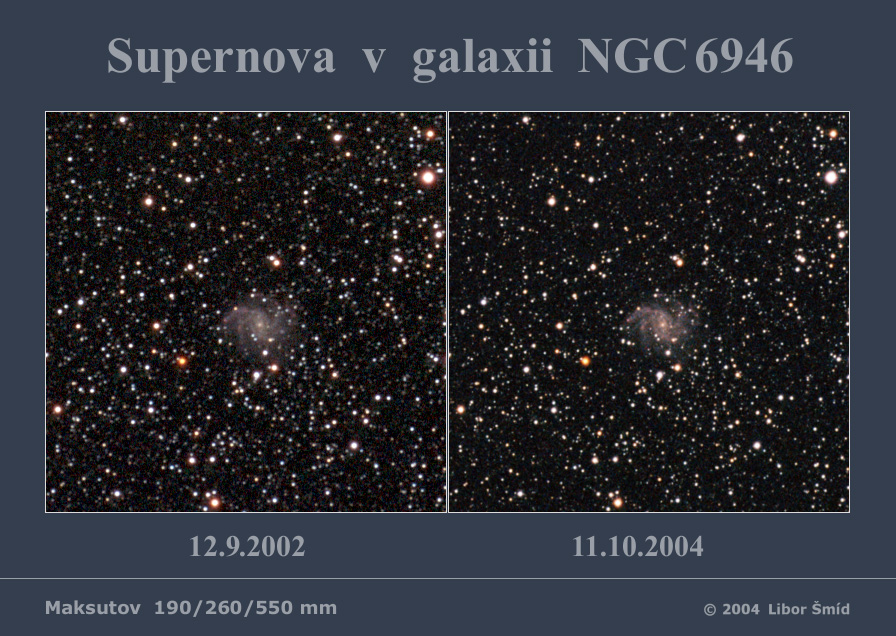 Im Oktober konnte man in der Galaxie NGC6946 eine ziemlich helle Supernova (zirka 13 mag) beobachten. Libor Šmíd hat sein Bild der Galaxie vor der Entdeckung der Supernova mit dem neuen Bild verglichen, das erst nachher gemacht wurde. Das Ergebnis können sie sich oben selber anschauen. Falls es für Sie schwer ist die Supernova zu finden, schauen Sie sich dieses gif an, wo sich beide Bilder abwechseln.