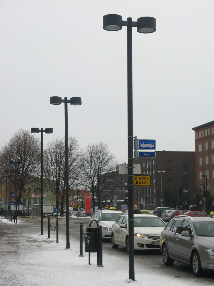 Prostor před nádražím v Turku je osvětlen plně cloněnými svítidly s