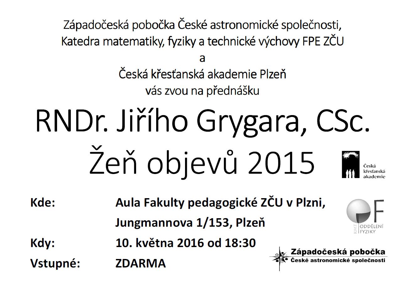 | 9. května 2016 | Jiří Grygar bude přednášet v Plzni: Žeň objevů 2015 | TZ (doc, 1,23 MB), foto 1 (jpg, 994 kB) foto 2 (jpg, 114 kB) |