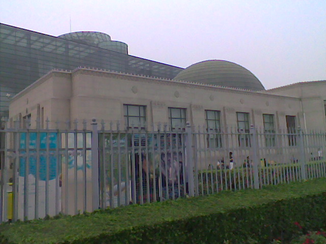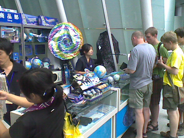Dnes rano jsme vnutili do oficialniho programu navstevu pekingskeho planetaria.Na prvnim obrazku je puvodni budova,ve ktere je umisten nejnovejsi pristroj Zeiss.V nove obrovske sklenene budove v pozadi je nekolik dalsich projekcnich salu az po 4D kino.My jsme shledli kratky program venovany slunecni soustave v sale vybavenem virtuariem firmy SGI (2.foto).V kazdem patre je obchod (3.foto), ve kterem maji vse pro astronomii.A cinani nakupuji a nakupuji (a cesi taky).Tesne za sklenenym monstrem se skromne krci budova hvezdarny.Obloha v Pekingu se pro pozorovani stejne nehodi.