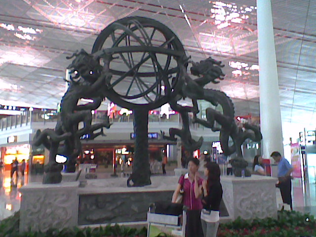 Jsme na letisti v Pekingu (foto 1).V hale se povaluji ruzne veci napriklad armilarni sfery (foto 2).Letiste je takove "male utulne" takze jsme mezi dvema halami jeli nekolik minut pomerne rychle vlakem.Uz mame i letadlo (foto 3) a vypada to,ze i poletime vcas.To zas bude 8,5 hodiny otrava.