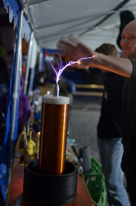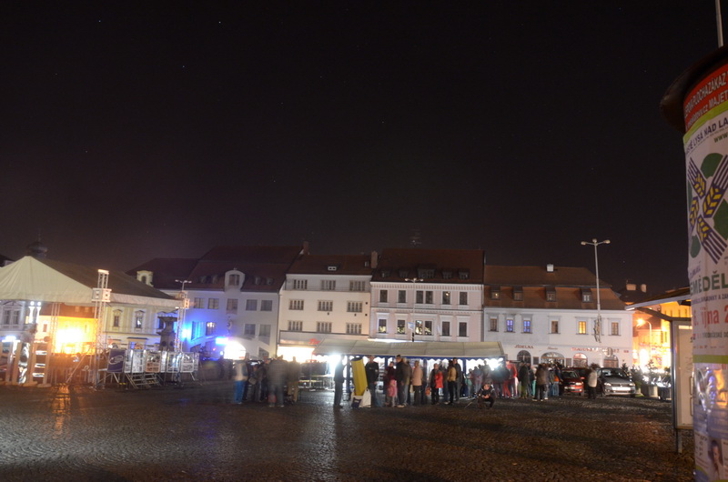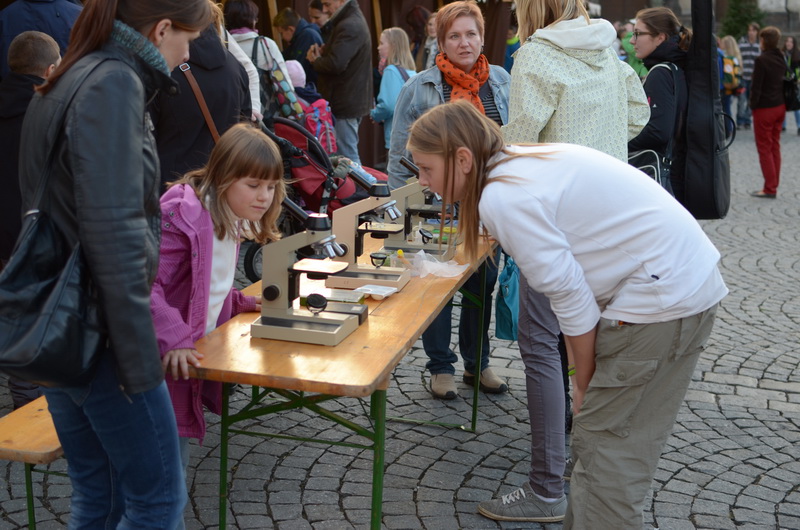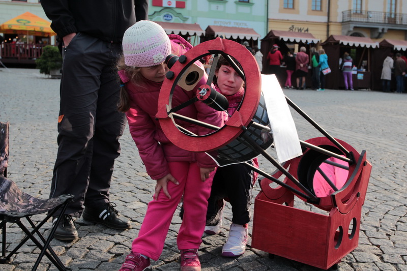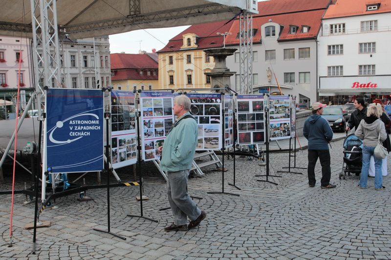 Noční program byl zpestřený astronomickým pozorováním jen díky tomu, že se na poslední chvíli umoudřilo počasí a my mohli pozorovat dovezenými dalekohledy hvězdokupy a další deep sky objekty. Což by nebylo možné bez zhasnutého pouličního osvětlení a kostela, které pro nás zajistilo město. V průběhu večera taky probíhaly různé pokusy, které byly velmi efektní.