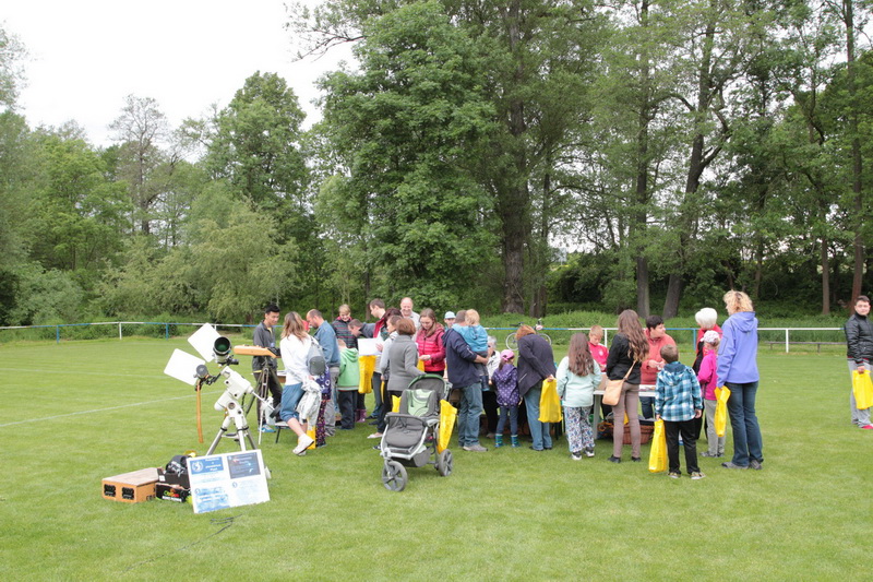 První byl zaměřen na pozorování Slunce. Vzhledem k oblačné obloze byl zaměřen na pozemní objekt. Další 2 dalekohledy s malým zvětšením byly zaměřeny na několik obrazců souhvězdí a účastníci měli podle pomocných obrázků určit, o která souhvězdí se jedná. Pro nejmenší byla připravena dřevěná astronomická skládačka, kde bylo nutno vložit vykrojené obrazce ( Slunce, Měsíc, komety, hvězdy) do správných otvorů. Tato hra měla prohloubit motorické dovednosti našich nejmenších. Dále si děti mohly složit puzzle s astronomickou nebo astronautickou tématikou a také si vyzkoušet test rovnováhy. Ten probíhal v podobě slalomu, kdy dítě neslo zpola naplněnou PET lahvičku na destičce podpíranou hůlkami. Děti byly na všech stanovištích odměněny drobnostmi a samozřejmě sladkostmi. Přesně v 17. hodin, kdy děti měly téměř všechno splněno, byl ohlášen seskok parašutistů. I v letošním roce to byla napínavá podívaná. Parašutisté se snesli v poměrně velké rychlosti bezchybně k zemi, což si zasloužilo potlesk přihlížejících. Následně si děti opekly špekáček a pořadatelé jim rozdali balónky nafouknuté héliem. Jako poslední a již nesoutěžní úkol dětí byl, vypustit naráz barevné balónky k nebi. Tato závěrečná část odpoledne bývá velmi poutavá, neboť po vznesení balónků vypadá nebe, jako by bylo poseto pestrobarevnými lentilkami..