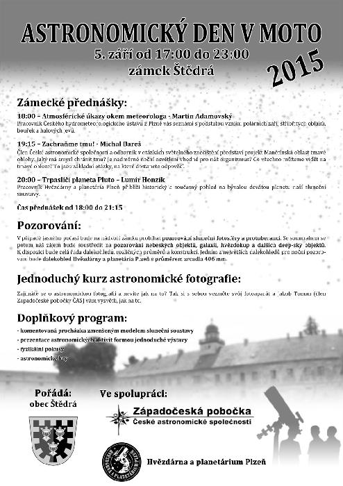 Západočeská pobočka České astronomické společnosti ve spolupráci s obcí Štědrá a Hvězdárnou a planetáriem Plzeň si Vás dovolují pozvat na Astronomický den v Manětínské oblasti tmavé oblohy, který se