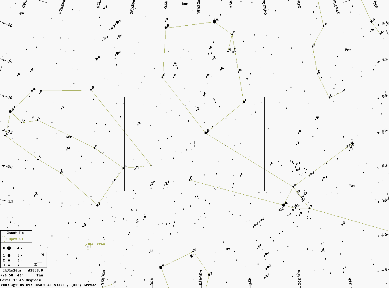 Jedná se o zákryt hvězdy UCAC2 41157396 (RA = 5:34:16,608; Dec = 26:50:46,61) planetkou 488 Kreusa ve čtvrtek 5. dubna 2007 večer (21:04 UT). Hvězda se nachází v souhvězdí Býka a naleznete ji přibližně 2 stupně jihovýchodně od "horního rohu Býka". Při pohledu z České republiky se vám oblast bude promítat v čase zákrytu nad západní obzor (A=281 st) přibližně 26,5 st vysoko nad horizont. Planetka má teoretický ideální průměr 150 km (13,4 mag) a trvání centrálního (nejdelšího) zákrytu bylo stanoveno na 5,5 s. Jako obvykle je však i u tohoto úkazu alespoň jedno ale.. Problémem, který na nás čeká je jasnost zakrývané hvězdy. Ta je pouhých 10, 9 mag (předpověď S. Preston), respektive 10,6 mag (Megastar). V obou případech to ovšem znamená, že pro úspěšné měření časů vstupu a výstupu, kdy hvězda musí být dobře pozorovatelná, je nutno použít co největší dalekohled, jehož aktuální mezná hvězdná velikost bude v okamžiku pozorování nad 11. mag. Veškeré dostupné detaily o úkazu se dozvíte z připojeného obrázku.