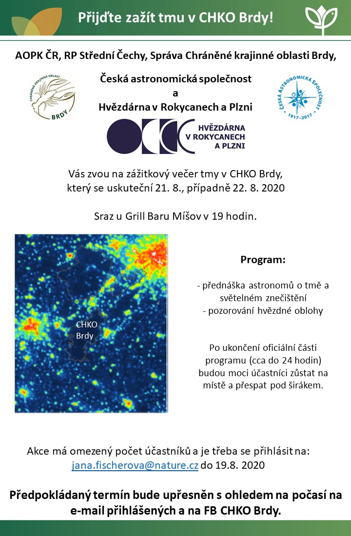 Správa Chráněné krajinné oblasti Brdy, Česká astronomická společnost a Hvězdárna v Rokycanech a Plzni vás zvou na zážitkový večer plný tmy v CHKO Brdy, který se uskuteční 21. 8. 2020 v Míšově.