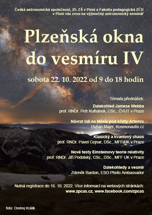 Vážení přátelé astronomie, přijměte pozvání na seminář "Plzeňská okna do vesmíru IV", který pořádá v sobotu 22. 10. 2022 v Plzni Západočeská pobočka České astronomické společnostive ve spolupráci s 25. ZŠ v Plzni a Fakultou pedagogickou ZČU. Jedná se skutečně o exkluzivní astronomický seminář, který je doslova našlapaný výjimečnými přednášejícími a svým obsahem navazuje na legendární populárně naučný seriál Okna vesmíru dokořán, který od roku 1981 vysílala Československá televize. Seriál vynikal nejenom svým námětem, na kterém se tehdy podílel Vladimír Železný, ale i vynikajícími komiksovými kresbami Káji Saudka či zajímavým hudebním doprovodem. Zlatou třešničkou pořadu pak byl český astronom, astrofyzik a popularizátor vědy Jiří Grygar, který provázel celým pořadem.