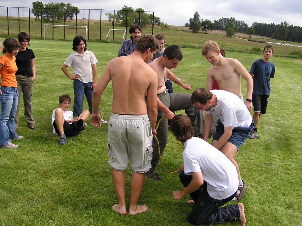 Vzhledem k tomu, že po cca 30 min běhání z nás všech stékal pot, byla další hra „Uzel“, méně náročná na fyzické schopnosti. Cílem této soutěže bylo provést co v nejkratším čase uzel na provaze, ovšem všichni členové skupiny se ho museli po celou dobu vázání držet jednou rukou.
