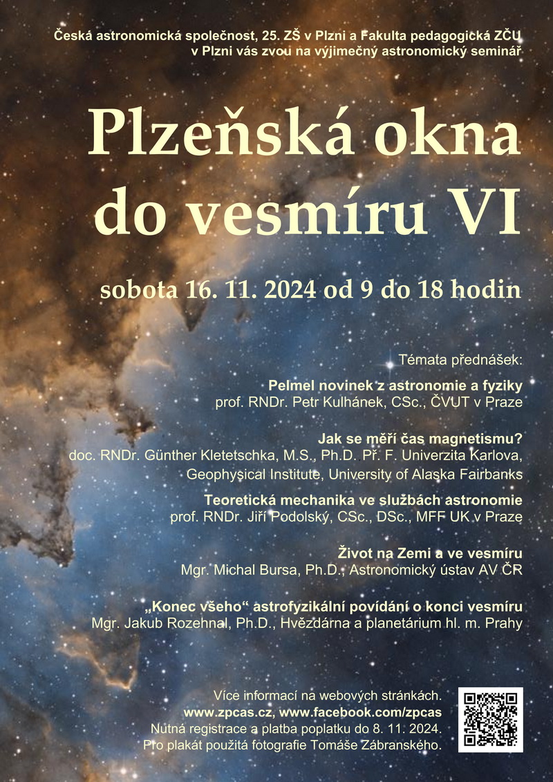 Vážení přátelé astronomie, rádi bychom vás pozvali na nadcházející astronomický seminář "Plzeňská okna do vesmíru VI", který se uskuteční v sobotu, 16. listopadu 2024, v Plzni na 25. základní škole. Tento seminář je pořádán Západočeskou pobočkou České astronomické společnosti ve spolupráci s 25. ZŠ v Plzni a Fakultou pedagogickou ZČU.