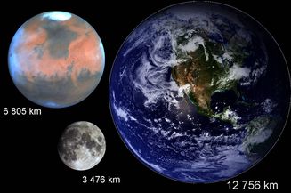 Srovnání velikostí Marsu, Měsíce a Země |