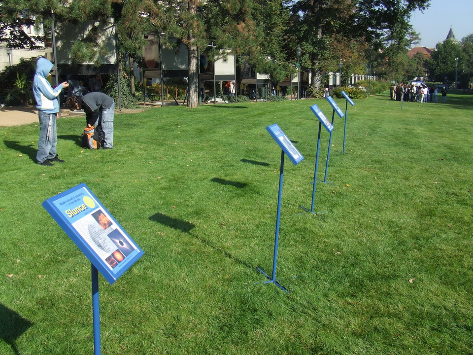 Stanoviště bylo opět umístěno kolem fontány před vchodem do Západočeského muzea a v přilehlých Šafaříkových sadech. Tento výběr není náhodný. Jedná se totiž o jedno z mála míst v plzeňském sadovém okruhu, ze kterého je po celý den vidět Slunce, jehož pozorování bylo součástí programu H+P Plzeň. Ale nejenom pozorování Slunce mohlo lákat návštěvníky k prohlídce našich expozic. Bylo by asi zdlouhavé vyjmenovávat jednotlivé experimenty či jmenovat jednotlivé exponáty, protože jich bylo opravdu hodně viz. přiložené fotografie, ale za zmínku určitě stojí připomenutí výstavy věnované problematice světelného znečištění, kterou reprezentovala H+P Plzeň, nebo Markovy pokusy s tekutým dusíkem ve stánku Hvězdárny v Rokycanech. Neměl bych ale taky zapomenout na úchvatné Coca-Colové gejzíry před stanem Katedry obecné fyziky, které dokreslovaly velice pěknou kulisu kašny před muzeem.