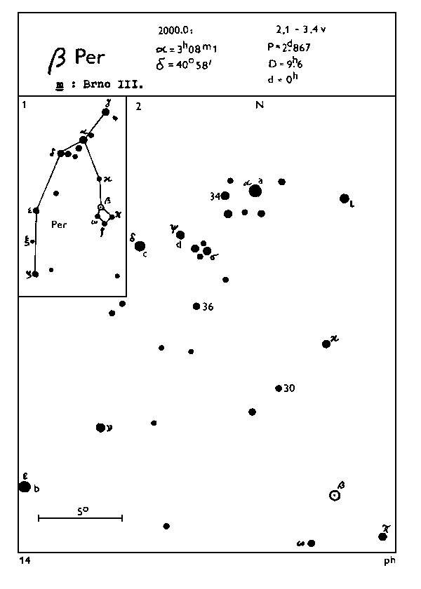 Aby jste lépe pochopili text na následujících řádcích, otevřete si v novém okně mapku pro hvězdu beta Persea (Algol). Na mapce jsou 2 rámečky. V prvním rámečku vidíte obrazec Persea, na kterém jsou vyznačeny nejjasnější hvězdy (označené řeckými písmeny: alfa, beta, gama ...). Nás bude zajímat hvězda beta Persea - naše proměnná. Ta je ve větší části mapky označená jako kolečko s černým puntíkem (někdy můžete narazit na mapu, ve které bude proměnná hvězda označená písmenem „v“). Kromě Algola tam můžete vidět i srovnávací hvězdy, které jsou označené písmeny a, b, c….