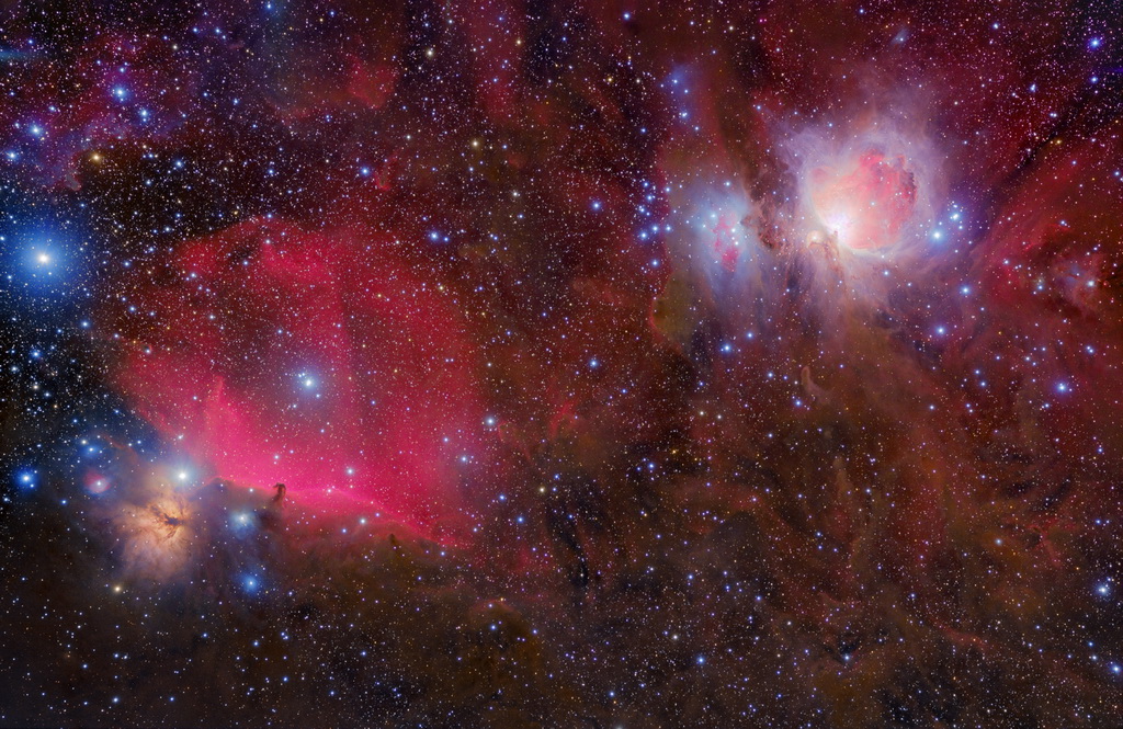 Snímek byl pořízen v lednu 2014 na Tenerife, jednom z ostrovů Kanárského souostroví, který je znám nejen jako ráj pro turisty a milovníky moře, ale i pro astrofotografy. Jeho celková expoziční doba dosahuje více jak 11 hodin, což už je velmi úctyhodný čas. Fotografie nám zobrazuje oblast okolo orionova pásu a meče, tedy region, který astronomové velmi dobře znají pro velké množství zajímavých mlhovin. Pokud se na něj podíváme podrobněji, zjistíme, že mlhoviny najdeme prakticky v každé jeho části. Některé oblasti si však zasluhují naši pozornost zejména.