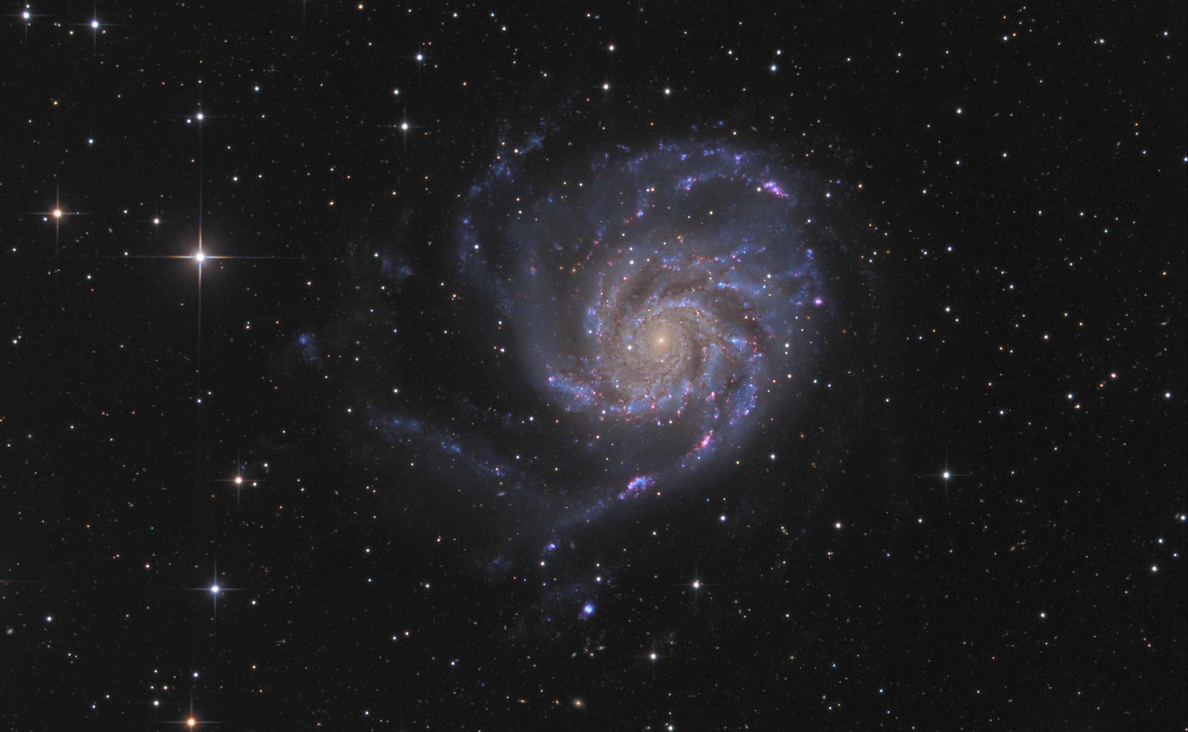 Na měsíc duben jsme do kalendáře ASTROFOTO 2021 vybrali velkou spirální galaxii M101 v souhvězdí Velká medvědice od Libora Šmída, pořízenou v Manětínské oblasti tmavé oblohy. Tato krásná galaxie s úhlovým rozměrem 28,5' x 28,3' a hvězdné velikosti +7,90 magnitudy nepatří mezi příliš atraktivní objekty k pozorování menšími dalekohledy, ale její krása vynikne především díky astronomické fotografii. Za povšimnutí stojí velmi pěkná struktura spirálních ramen, díky které tato galaxie získala označení „Větrník“. Od Země je vzdálená více než 27 milionů světelných let a její skutečný průměr je asi 1,7 krát větší než průměr naší Galaxie.