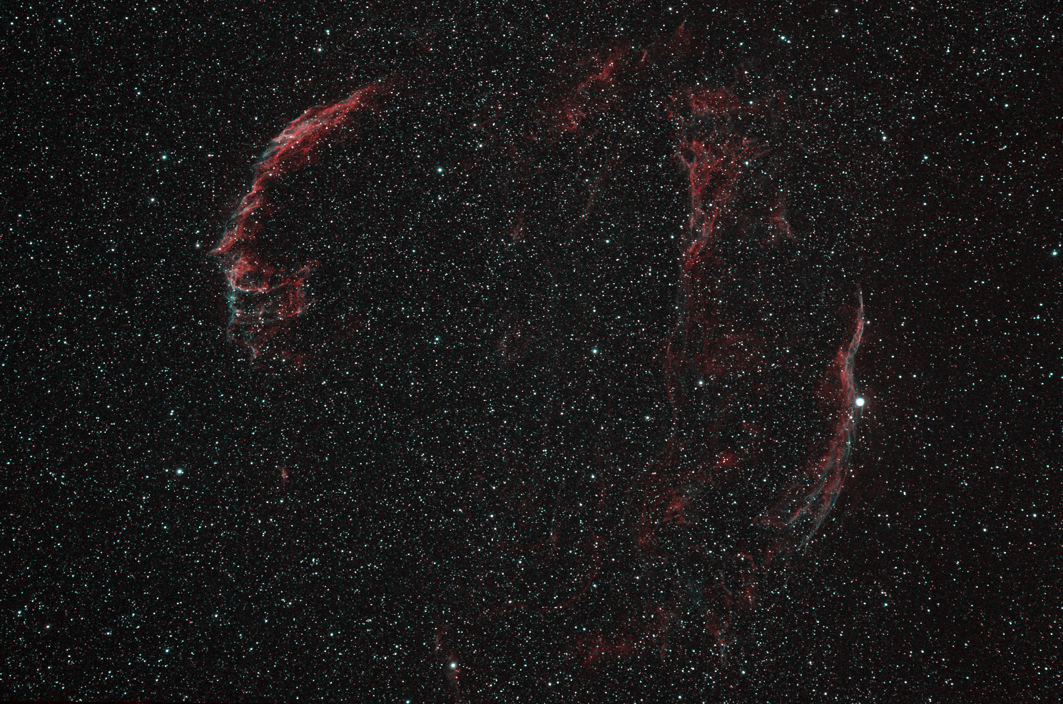 This picture show the rest of supernova explosion in Cygnus about 15000 years ago, also known as Veil Nebula (NGC 6992). This repudiation material from supernova move slowly in space from the epicentrum of the explosion and desintegrate in time. Distance of this nebula is estimated as 2600 light years and individual fibres can be clearly seen in telescope.