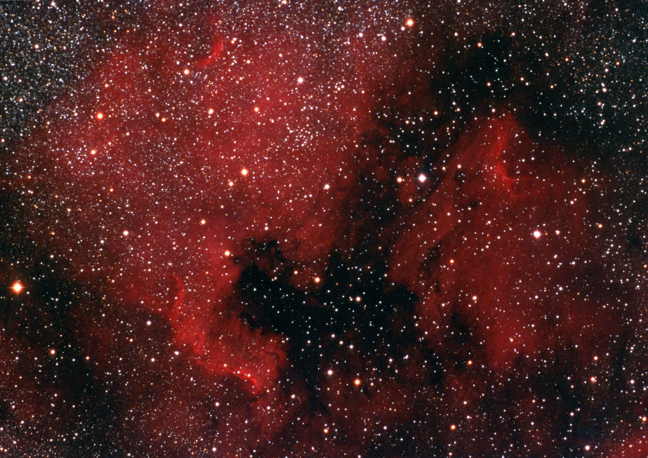 Další velkou a překrásnou emisní mlhovinou v souhvězdí Labutě je mlhovina s označením NGC 7000, známější však spíše pod názvem Severní Amerika. Při pohledu na snímek je patrné, proč dostala tento název, protože její podobnost s tímto kontinentem je prakticky dokonalá. Stejně jako u mlhoviny IC 1318 je i Severní Amerika buzena k záření jasnou hvězdou, která se však na snímku nenachází. Jedná se o hvězdu Deneb, nejjasnější hvězdu v Labuti, která také zároveň patří mezi nejjasnější hvězdy oblohy. Je vzdálena stejně jako mlhovina přibližně 2200 světelných let. Za bezměsíčných letních nocí je na temné obloze viditelná i pouhým okem, ale největší krásu ukáže až na fotografiích s dlouhou expozicí.