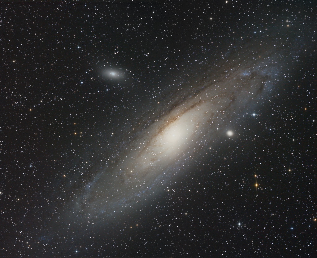 Galaxie M 31 nebo také Velká mlhovina v Andromedě je někdy považována za nejvzdálenější objekt, který je možné pozorovat pouhým okem. Vzdáleností 2.2 milionu světelných let se ale paradoxně řadí mezi nejbližší sousedy naší galaxie. Je jí také velmi podobná i co se týče velikosti a počtu hvězd. Obsahuje několik stovek miliard hvězd a nachází se v ní i objekty, které známe z naší galaxie jako například kulové hvězdokupy. Stejně jako ta naše má i galaxie v Andromedě několik menších průvodců, galaxií, v její blízkosti. Na snímku jsou dobře patrné. Obě dvě se řadí k eliptickým galaxiím a za mnoho milionů let se pravděpodobně srazí s Velkou galaxií a splynou s ní.