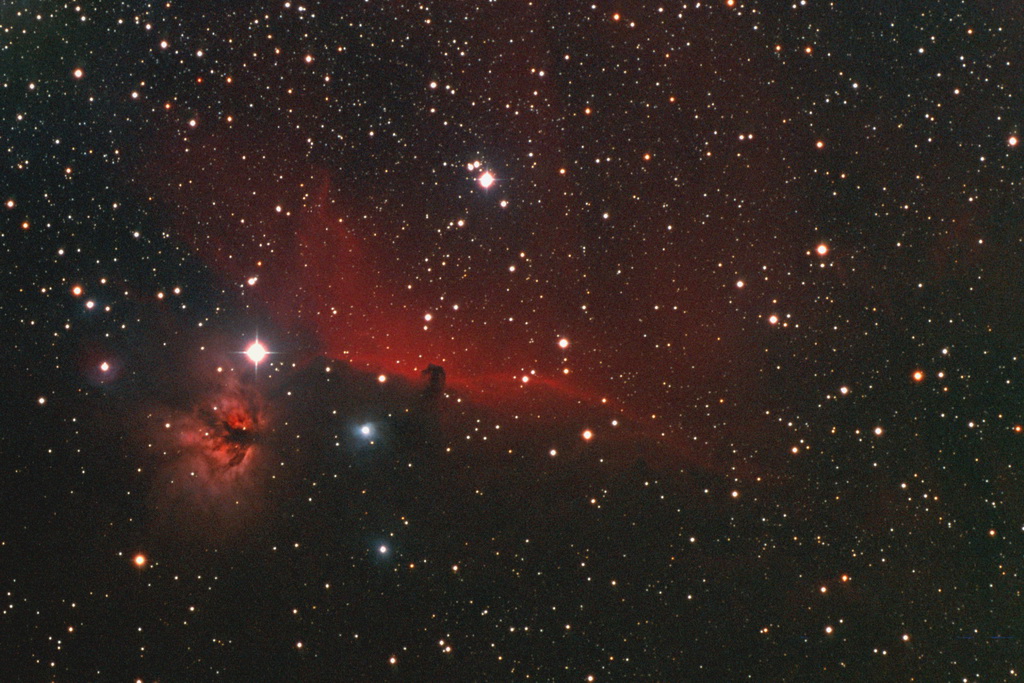 Mlhoviny v okolí hvězdy Alnitak, levé hvězdy Orionova pásu. Vlevo od hvězdy je jasnější difuzní emisní mlhovina NGC 2024 - Plamínek o úhlovém průměru 25'. Pod hvězdou je slabší protáhlá difuzní emisní mlhovina IC 434, do níž zasahuje temná mlhovina B 33 - Koňská hlava, připomínající hlavu šachového koně.