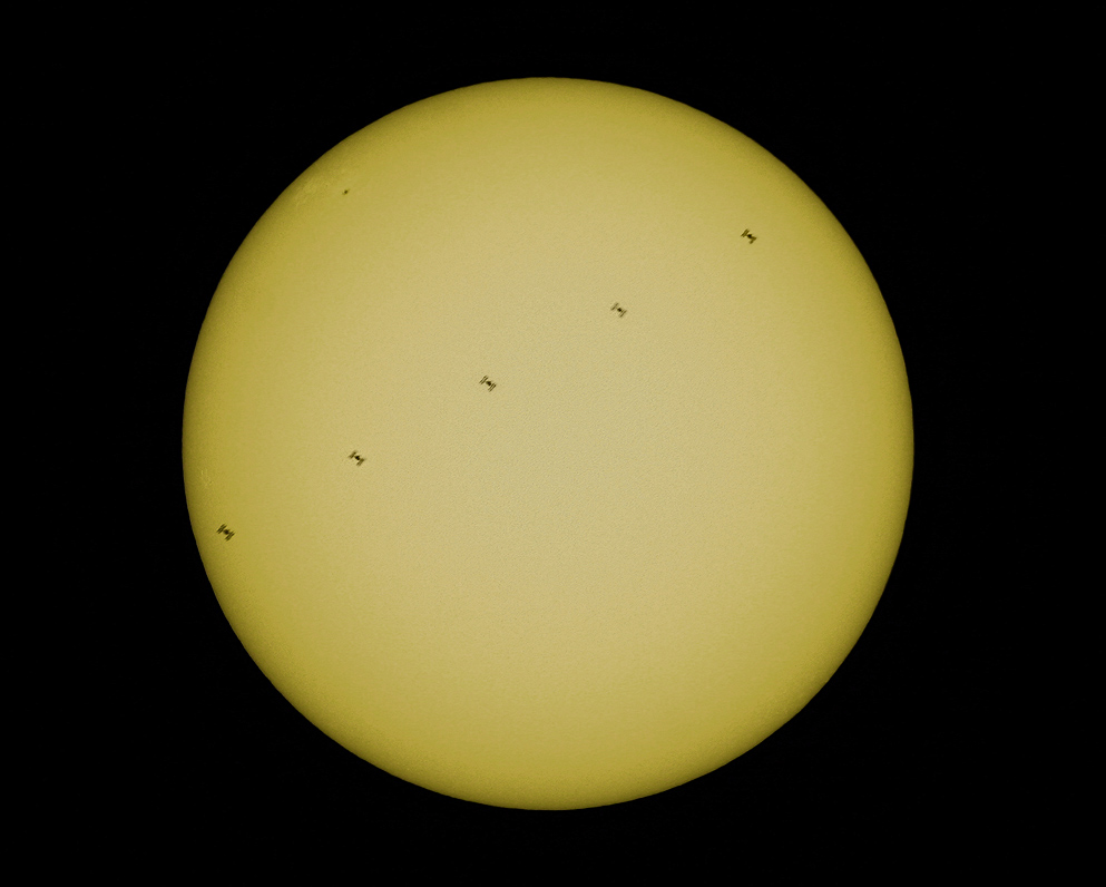 Na 12.9.2010 byl programem CalSKY předpovězen přelet Mezinárodní kosmické stanice přes Slunce. Vzdálenost osy stínu procházela jen 190 m od budovy H+P, což při šířce pásu 7.08 km bylo prakticky na středu. Proto jsme si tento nevšední úkaz nemohli nechat ujít. Vzdálenost ISS 577 km byla sice větší, než při našem prvním pozorování tohoto úkazu v roce 2006 a proto i velikost ISS vycházela menší, ale o to pomaleji se pohybovala a proto se jí podařilo zachytit na pěti snímcích. Přelet přes Slunce trval pouze 1.01 s. Kromě ISS je na Slunci možno pozorovat i jednu sluneční skvrnu a několik fakulových polí.