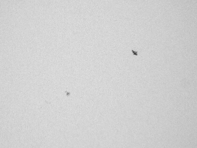 K nasnímání byl použit digitální fotoaparát Canon 350D, protože je zdánlivý pohyb stanice velmi rychlý (přes celý kotouč Slunce přeletí za cca 0,6s, což bylo tedy trvání celého úkazu) a tento fotoaparát umožňuje sekvenční snímání rychlostí 3 snímky za sekundu. Na snímku je zachycena ISS poblíž menší sluneční skvrny. Pro lepší představu o zdánlivé velikosti ISS a Slunce je ještě uveden celkový záběr v menším rozliąení. Vyfotografováno pomocí dalekohledu S-W ED80, expozice 1/4000s.