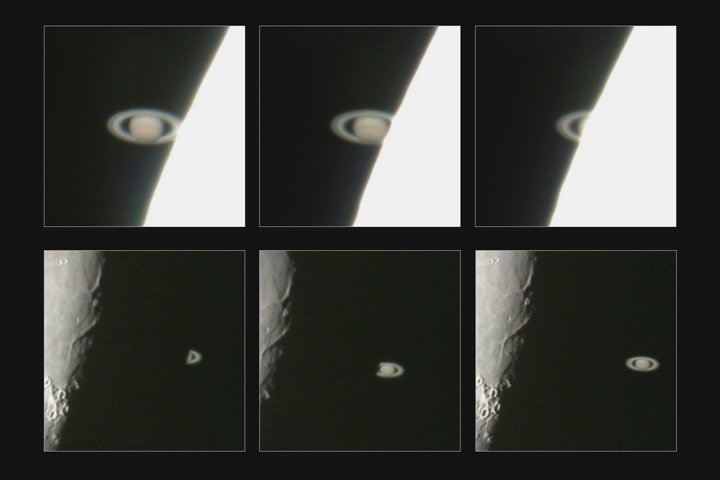 Zákryt Saturnu Měsícem je poměrně vzácný a velmi krásný úkaz. Proto mne velmi příjemně překvapilo, že 3. listopadu 2001 bylo jasno a mohl jsem tento zákryt pozorovat. Pomocí dalekohledu Newton 355/1600 mm jsem pořídil videozáznam tohoto úkazu. Vstup probíhal za osvětlenou stranou Měsíce, který Saturn hodně přezařoval, avšak výstup byl za neosvětlenou stranou a Měsíc rušil jen minimálně. Následující fotografie jsou vybrány z tohoto videozáznamu. Horní řada zachycuje vstup, dolní výstup.