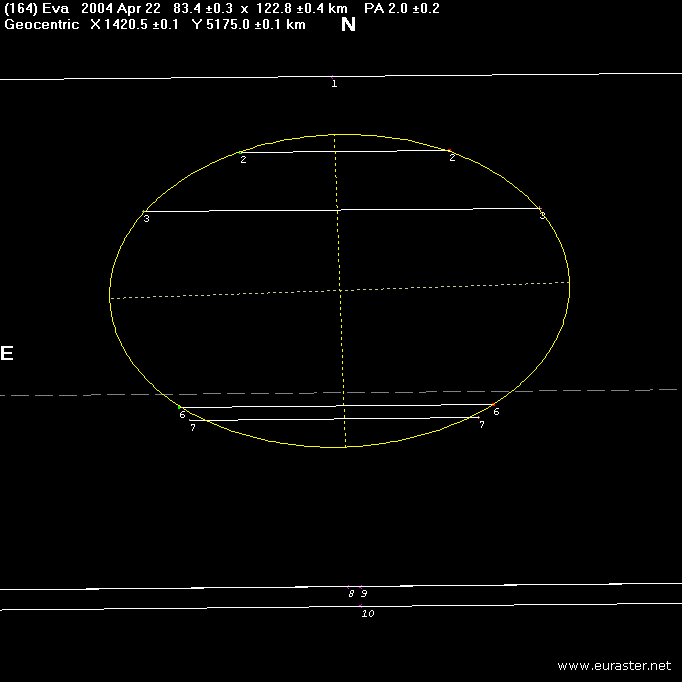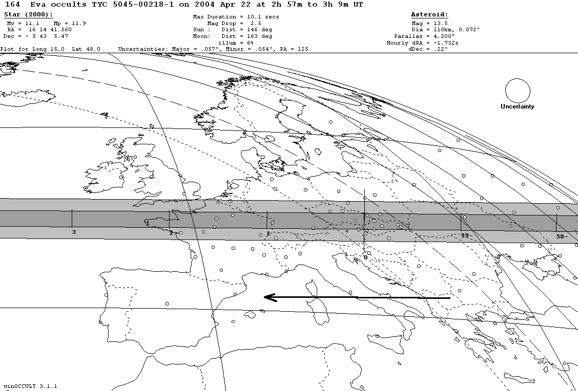 V odborném tisku jste byli upozorněni na velice nadějné vyhlídky v souvislosti s upřesněnou předpovědí zákrytu hvězdy TYC 5045-00218-1 (11,2 mag) planetkou (164) Eva. Předpokládaný pás stínu protínal v trvání maximálně 10 s střední Evropu. K úkazu ovšem docházelo 22. dubna časně ráno za nastupujícího svítání.